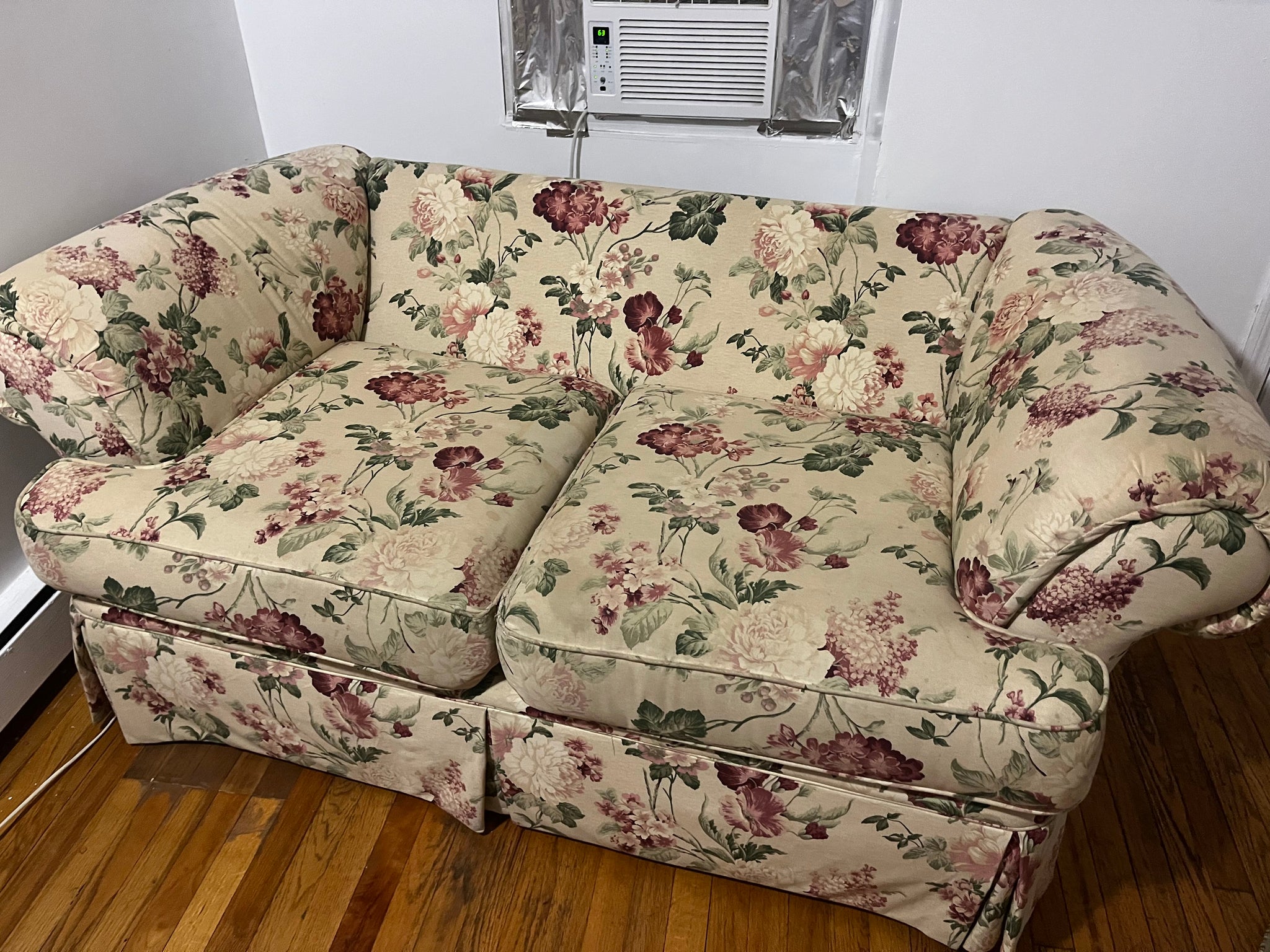 This two-seat sofa has been gently used and kept in a secondary home for less than two years—clean, odor-free, and ready for its next home. Its subtle floral palette complements both neutral and colorful interiors, blending comfort with sophistication.